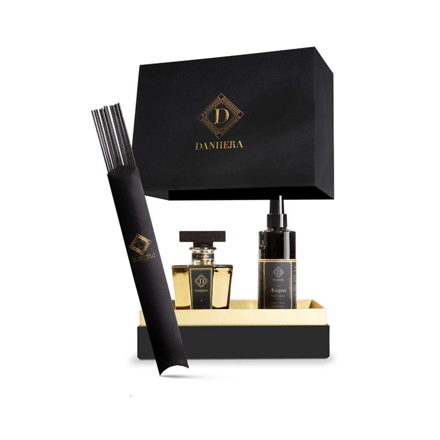 Il Cofanetto Luxury Medium si presenta come un piccolo tempio dell’Arte Olfattiva. Linee nette, profilo architettonico, nero assoluto che incornicia l’oro: una scultura da esporre, prima ancora che da aprire. Il coperchio, come un baldacchino, svela un vassoio prezioso: il Decanter IMPERO GOLD appare come un obelisco luminoso, il Natural Spray come colonna gemella, due presenze che raccontano la bellezza del gesto e la potenza del profumo.