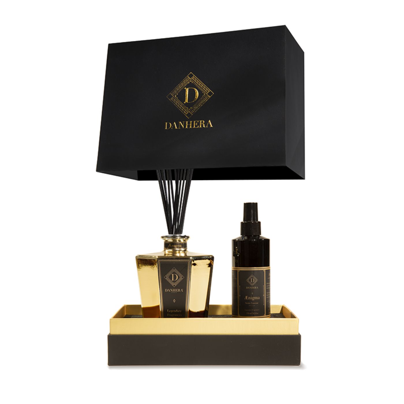Il cofanetto Luxury Premium si presenta come un tempio dell’Arte Olfattiva. Linee nette, profilo architettonico, nero assoluto che incornicia l’oro: una scultura da esporre, prima ancora che da aprire. Il coperchio, come un baldacchino, svela un vassoio prezioso: il Decanter IMPERO GOLD appare come un obelisco luminoso, il Natural Spray come colonna gemella, due presenze che raccontano la bellezza del gesto e la potenza del profumo.