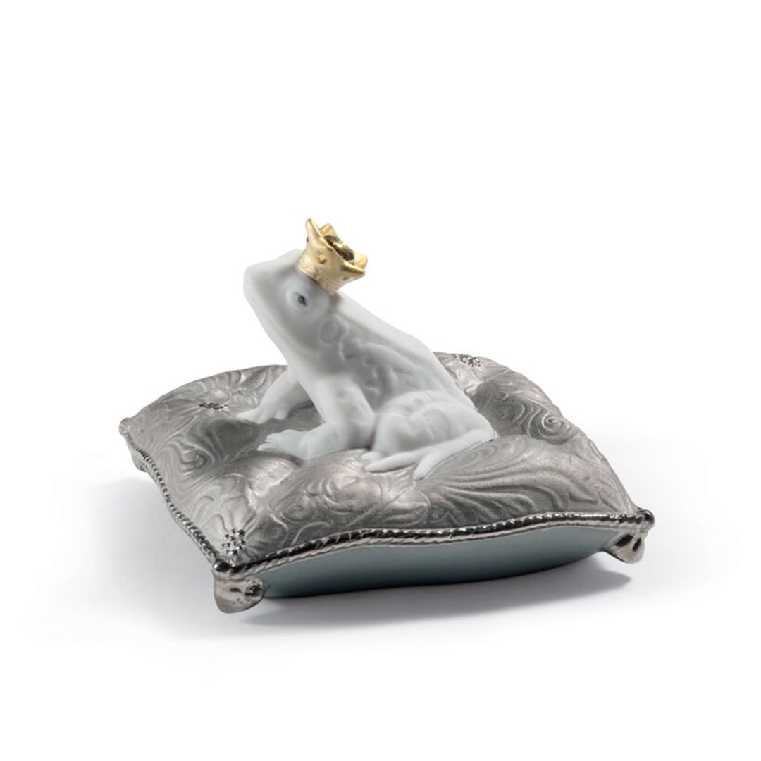 Ranocchio, in porcellana bianca con corona in oro, posto su un cuscino con decorazioni damasco e argento lucido.