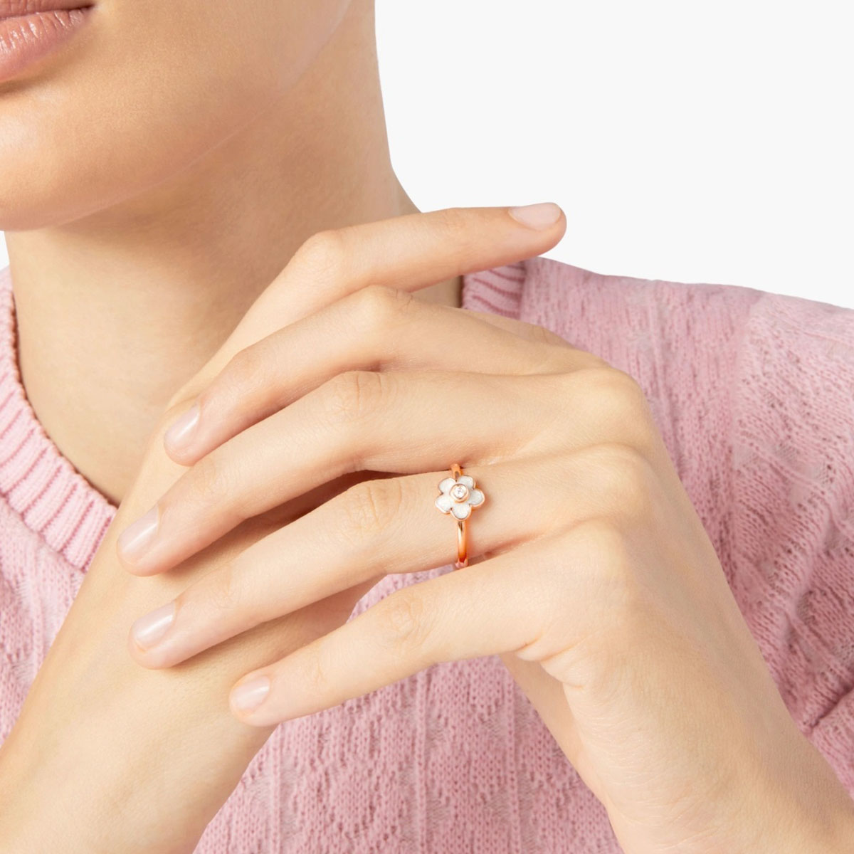 Anello fiore in oro rosa 9K, smalto effetto madreperla e 1 diamante bianco centrale (ct 0.03).