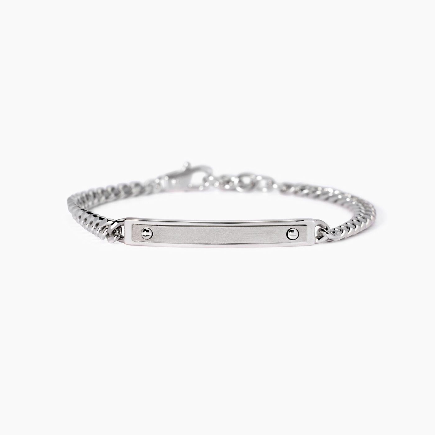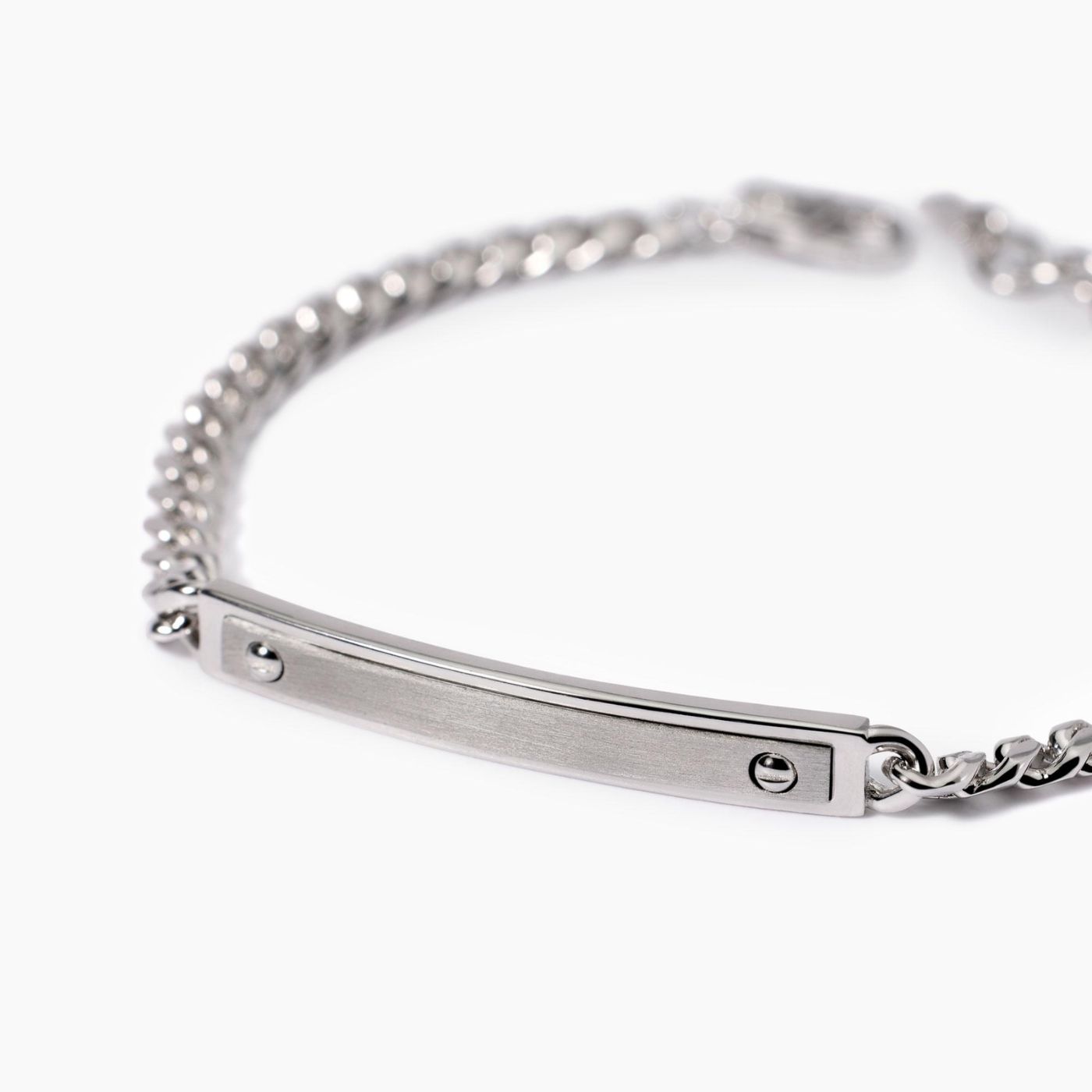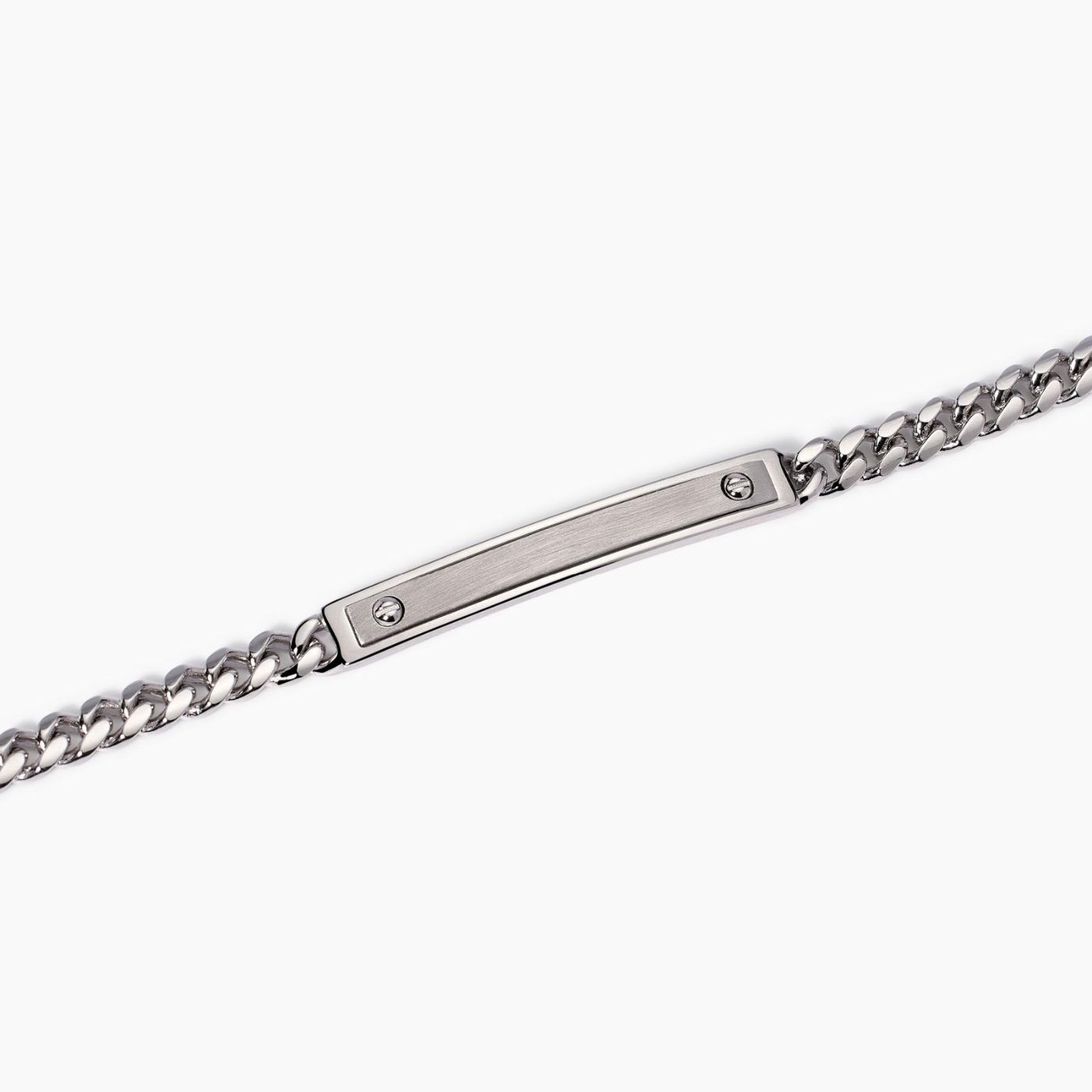 Bracciale regolabile da uomo in argento rodiato con catena groumette diamantata e piastra centrale con elemento satinato.