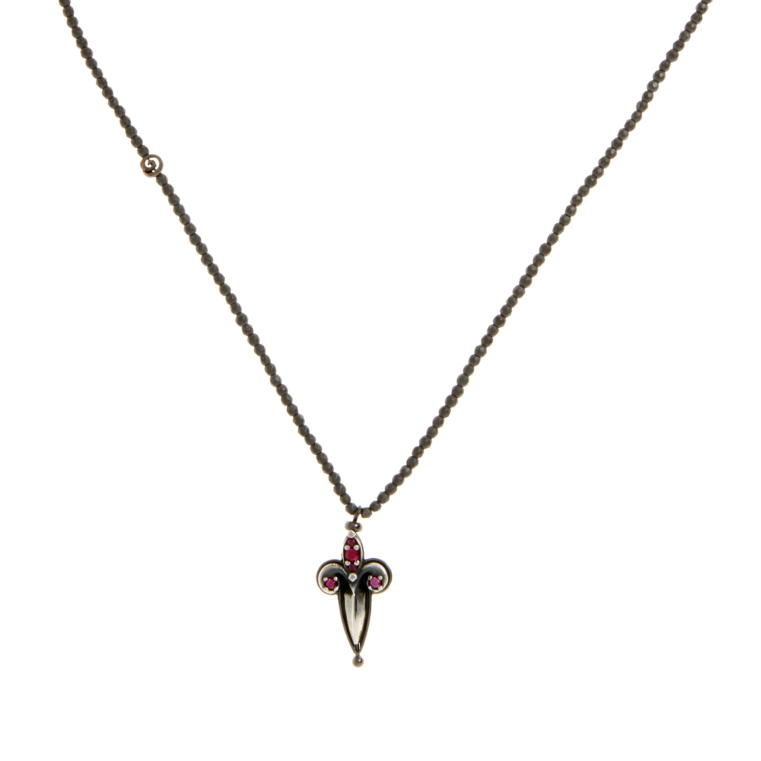 Lunghezza 50 con chiusura in argento brunito con possibilità di regolazione misura tramite anelli vicino alla chiusura ,pugnale in argento 925 brunito con zirconi rossi misura 2,5 cm x1,5 cm
