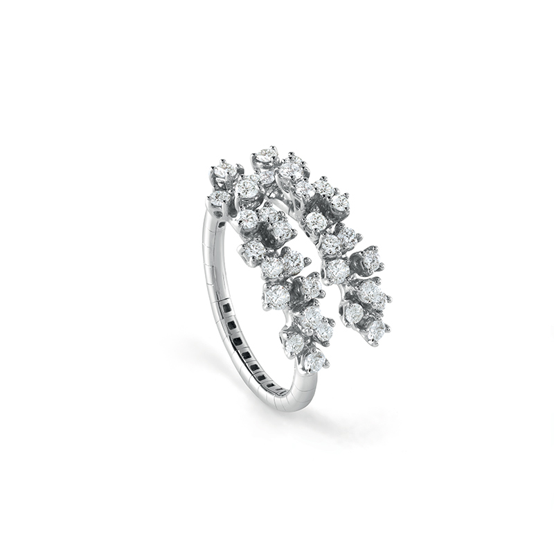 La collezione presenta dei bellissimi anelli, con un design che ricorda la forma di un fiore, moderno e insieme senza tempo con le pietre incastonate intorno a una pietra centrale più grande.