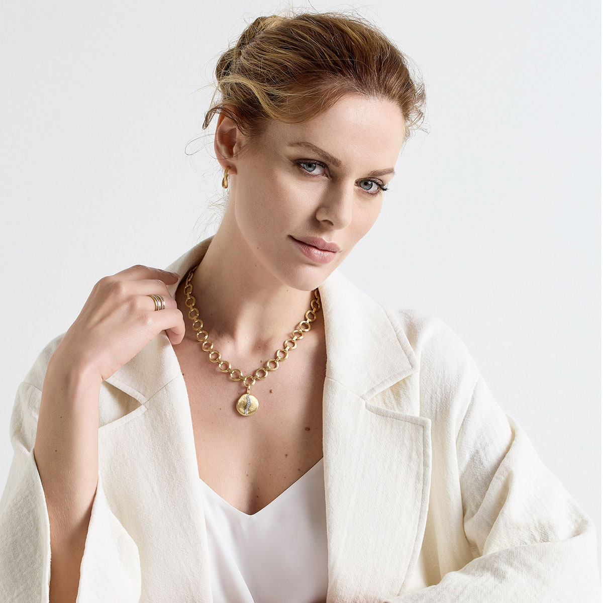 Un elegante pavé di diamanti taglio brillante, dalle linee irregolari e dal design sofisticato, impreziosisce questo pendente. In oro giallo 18kt, è inciso a mano con l’antica tecnica del bulino millerighe.