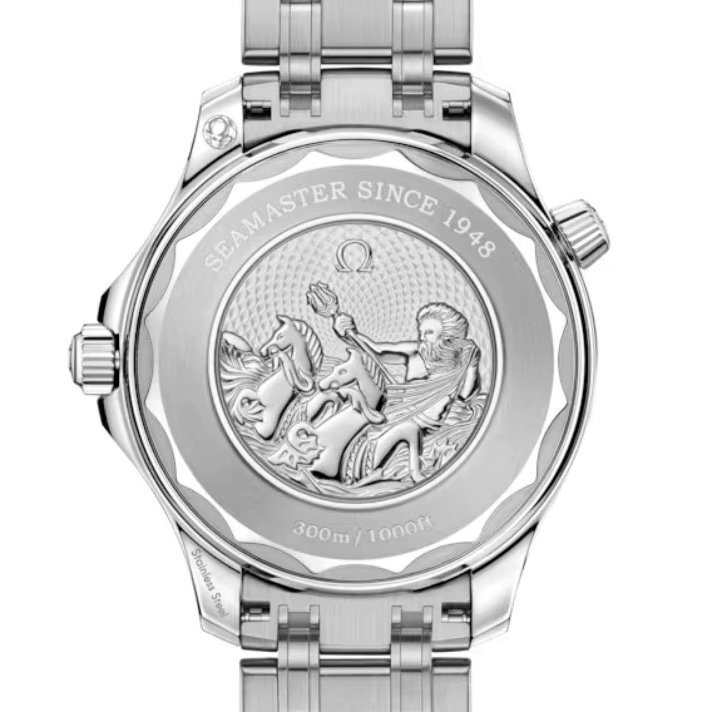 Girando l'orologio si scopre un logo commemorativo Seamaster stampato, che raffigura Poseidone con il suo tridente e due cavallucci marini: il logo OMEGA originale del 1956 si unisce a quello attuale. Dietro il fondello si cela il calibro OMEGA Co-Axial Master Chronometer 8800, certificato dall’Istituto Federale Svizzero di Metrologia (METAS) secondo i più elevati standard del settore.