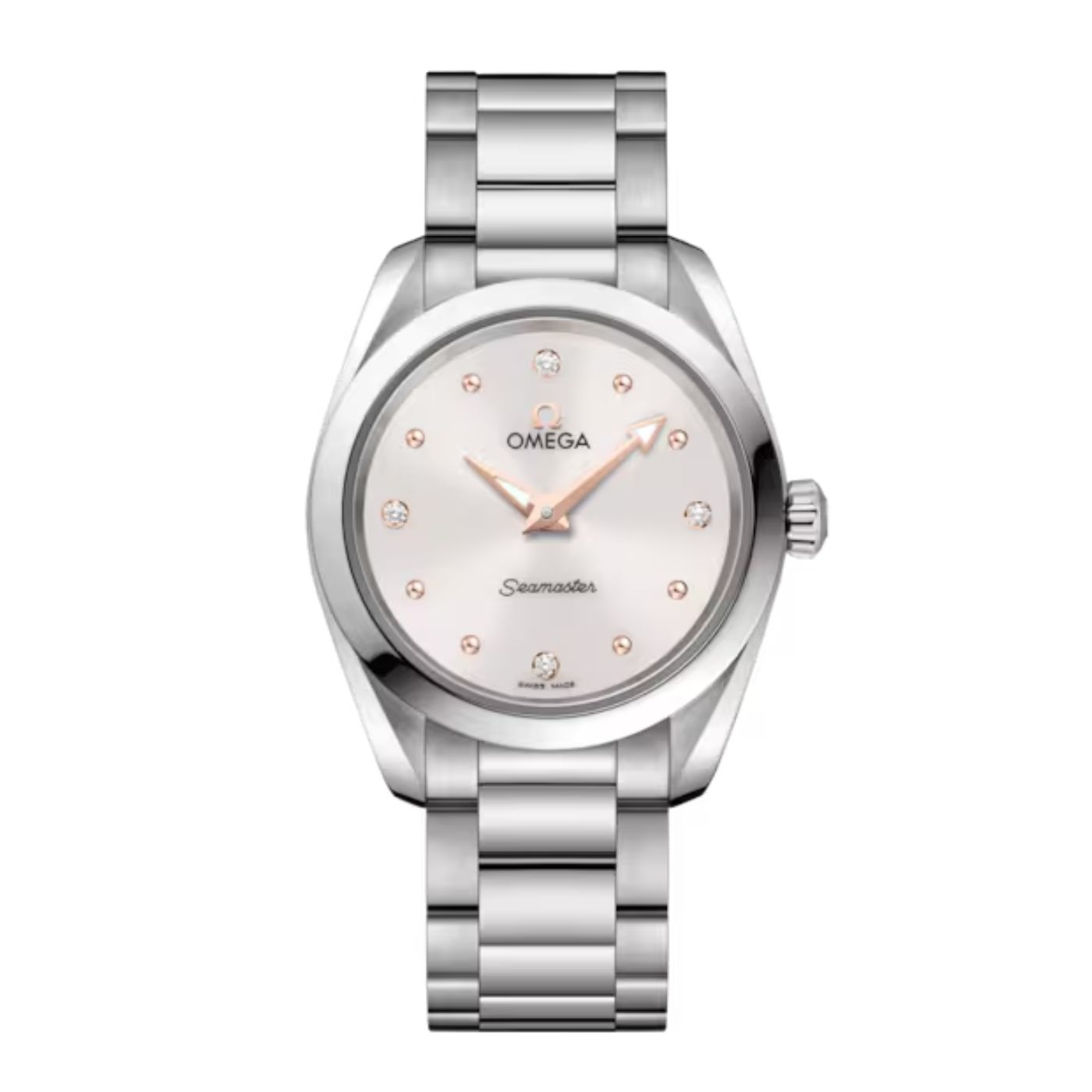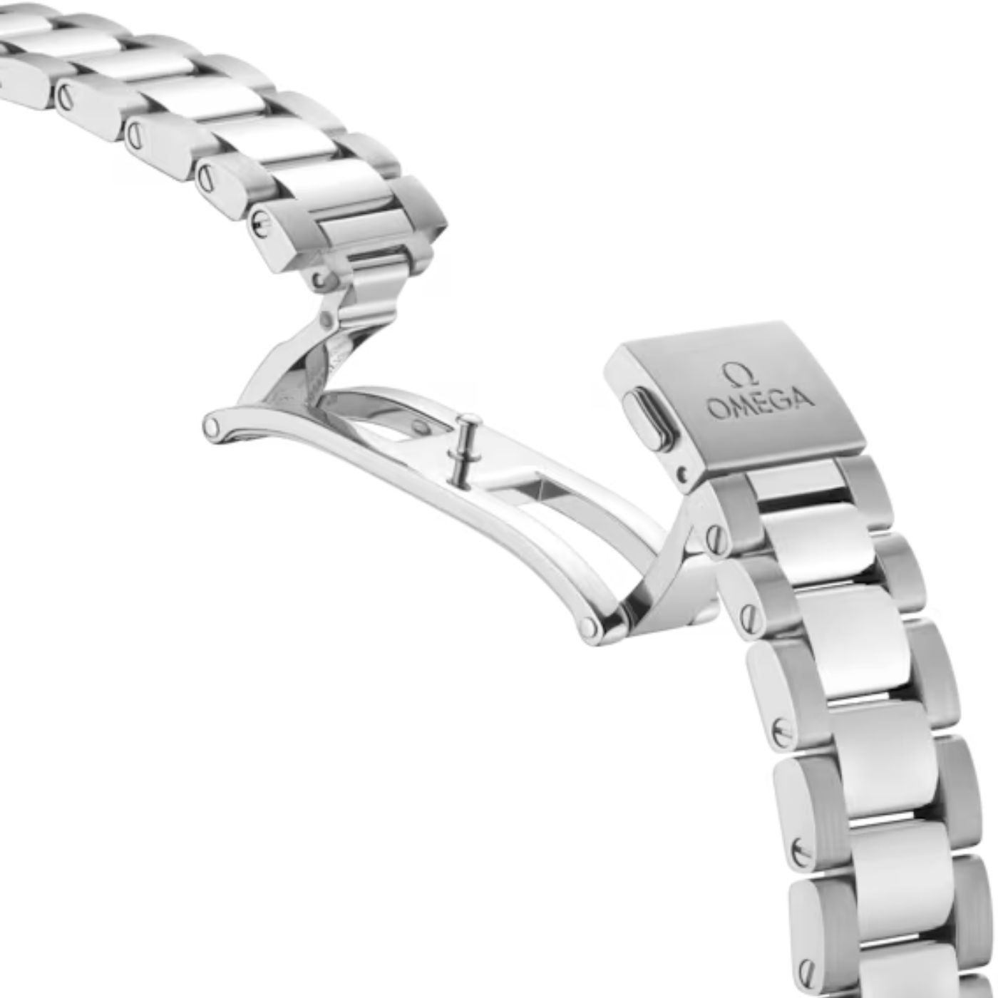 Con una cassa simmetrica da 28 mm, questo modello in acciaio inossidabile presenta un quadrante bianco brillante con 8 puntatori in oro Sedna™ 18K e 4 indici di diamanti incastonati in supporti in oro Sedna™ 18K. Anche le lancette sono in oro Sedna™ 18K, mentre il fondello reca la goffratura dell’ippocampo OMEGA su sfondo ondulato.